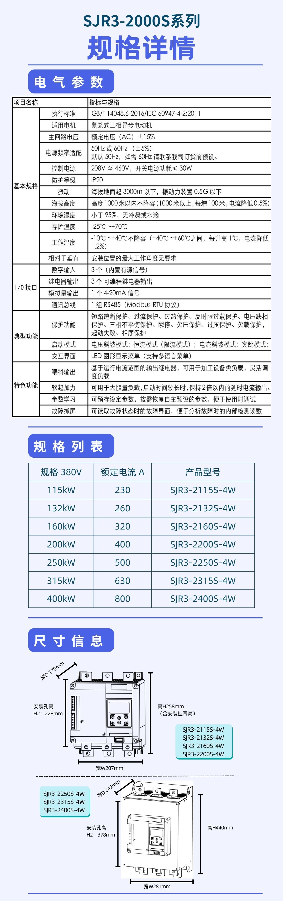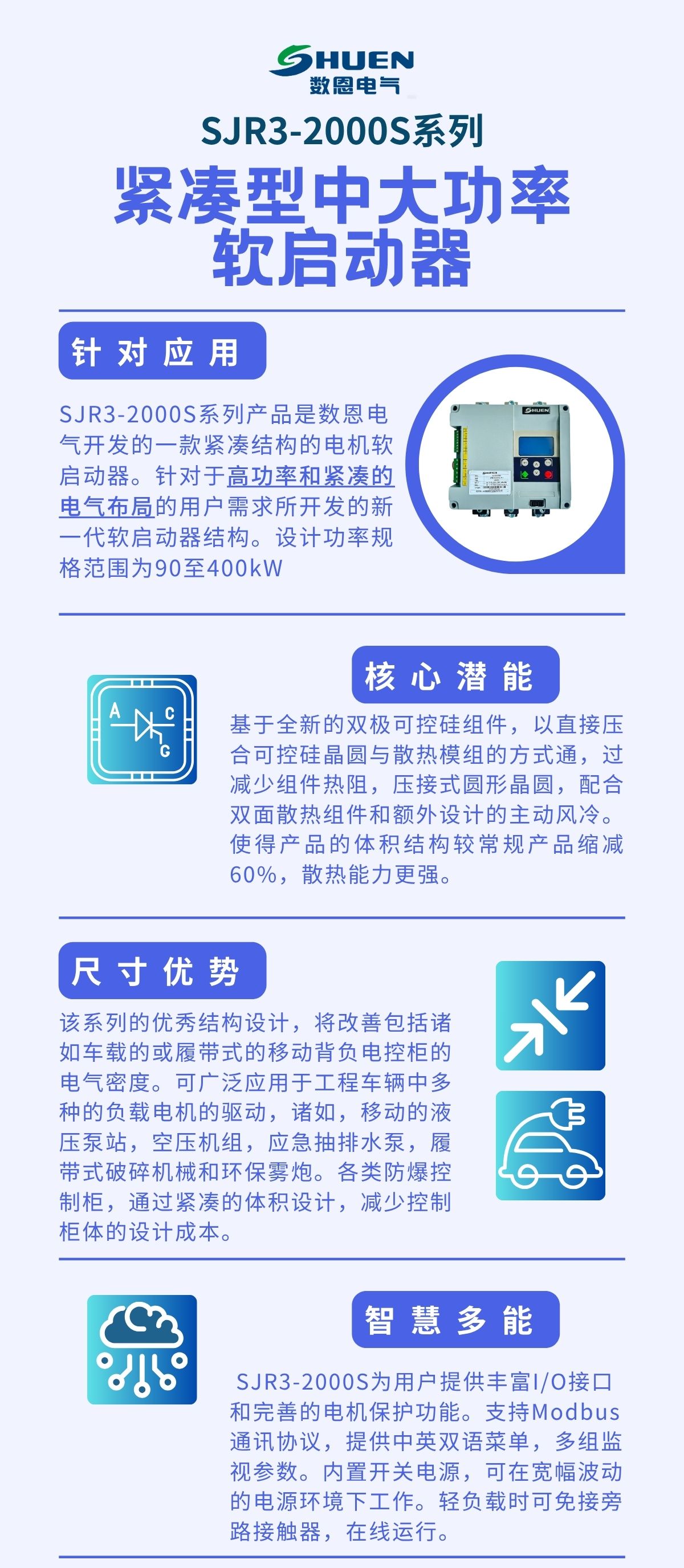 SJR3-2000S是welcome海洋之神公司最新研发的超紧凑软启动器,针对紧凑的车载(履带式)电柜 / 防爆电箱 / 壁挂基业箱 提出高密度电气解决方案,兼容在线式应用的同时兼备有外置旁路连接方式,增加了欠载,运行次数,运行时间,线性的温度监控等多种功能,内置集成了RS485通讯总线,提供多语种菜单。